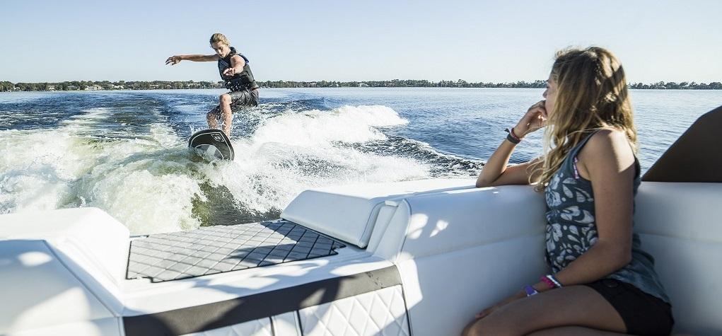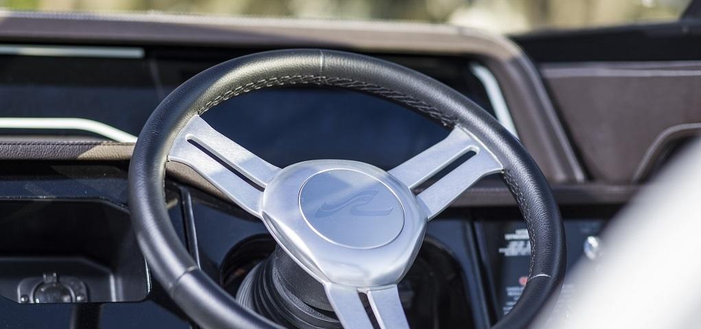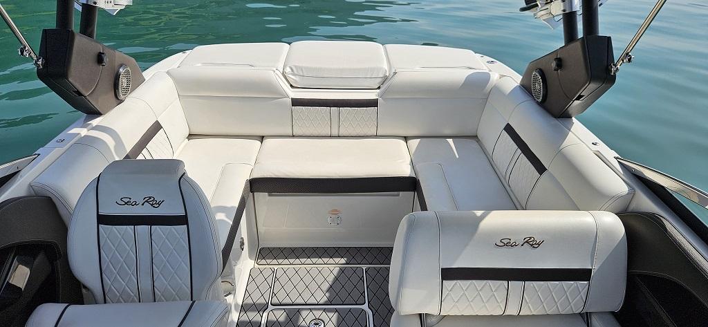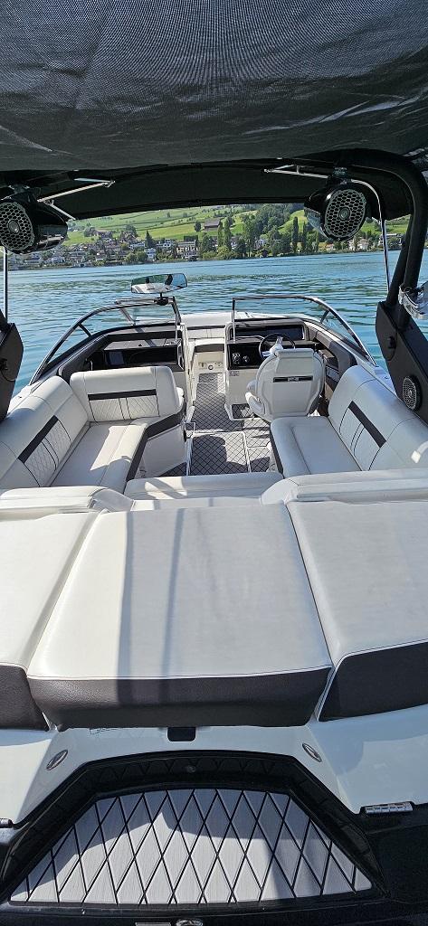 Ausstattung: Polsterfarbe: Sand (pearl – chocolate); Schalenfarbe 3-Ton: weiss-schwarz-weiss; Füllkissen für Bug; Fahrersitz höhenverstellbar; Cockpittisch, Tisch für Bug; Cockpitbodenbelag SeaDek (Farbe: Storm grey over mocha); Cockpitheizung – Heissluftventilator; Flaggenmast mit Sockel & Flagge; FenderClips, Dynamics Electronics Display, Seekarte: Alpine Lakes & Rivers, Anlegescheinwerfer 2x im Bug; Cockpitbeleuchtung blau; Unterwasserbeleuchtung an Schale im Heckbereich 2x blau; Joystick mit Heckstrahlruder Vetus, Luftkompressor; Stereoanlage Premium Fusion mit Subwoofer und Verstärker; Fusion Tower Lautsprecher 2x; Unterwasserplattform manuell absenkbar; Wakeboard-Racks drehbar 2x; Rückspiegel Premium PTM; Windschutzscheibenrahmen oben in Chromstahl; Hafendecke Stamoid Farbe: beige; Bug-Decke aus Stoff zum einknöpfen – Farbe schwarz; Sonnendachverlängerung Heck mit Reissverschluss mit Carbon-Stangen, Vertäuungsvorrichtung - 4 Tau mit Forcheda Ruckdämpfern. Unterwasseranstrich neu; Frisch ab Service - Vorführbereit.